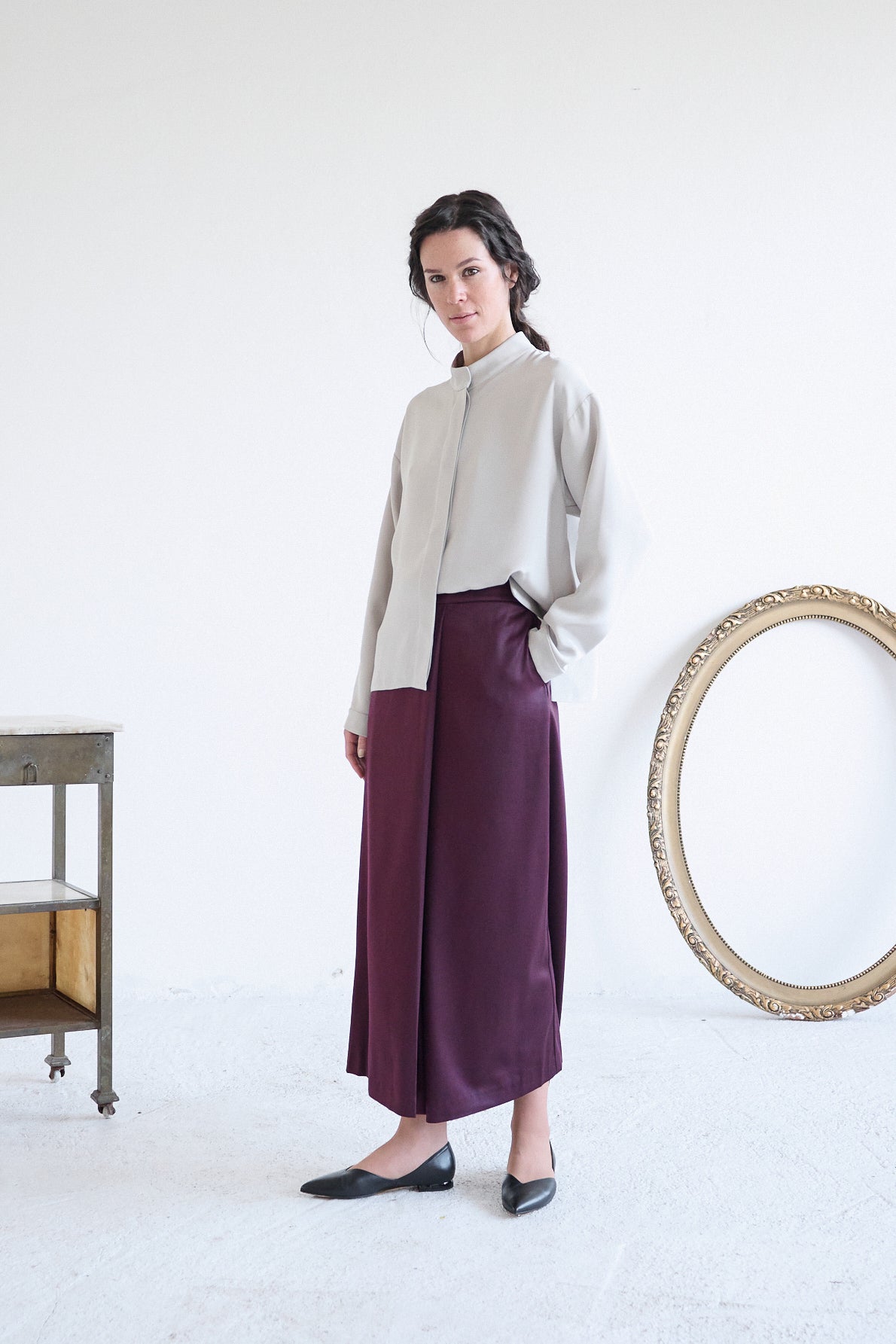 Košile z prémiového splývavého italského hedvábí silné gramáže. Skryté zapínání na knoflíčky. Rozparky po stranách umožňují variace se stylingem modelu.