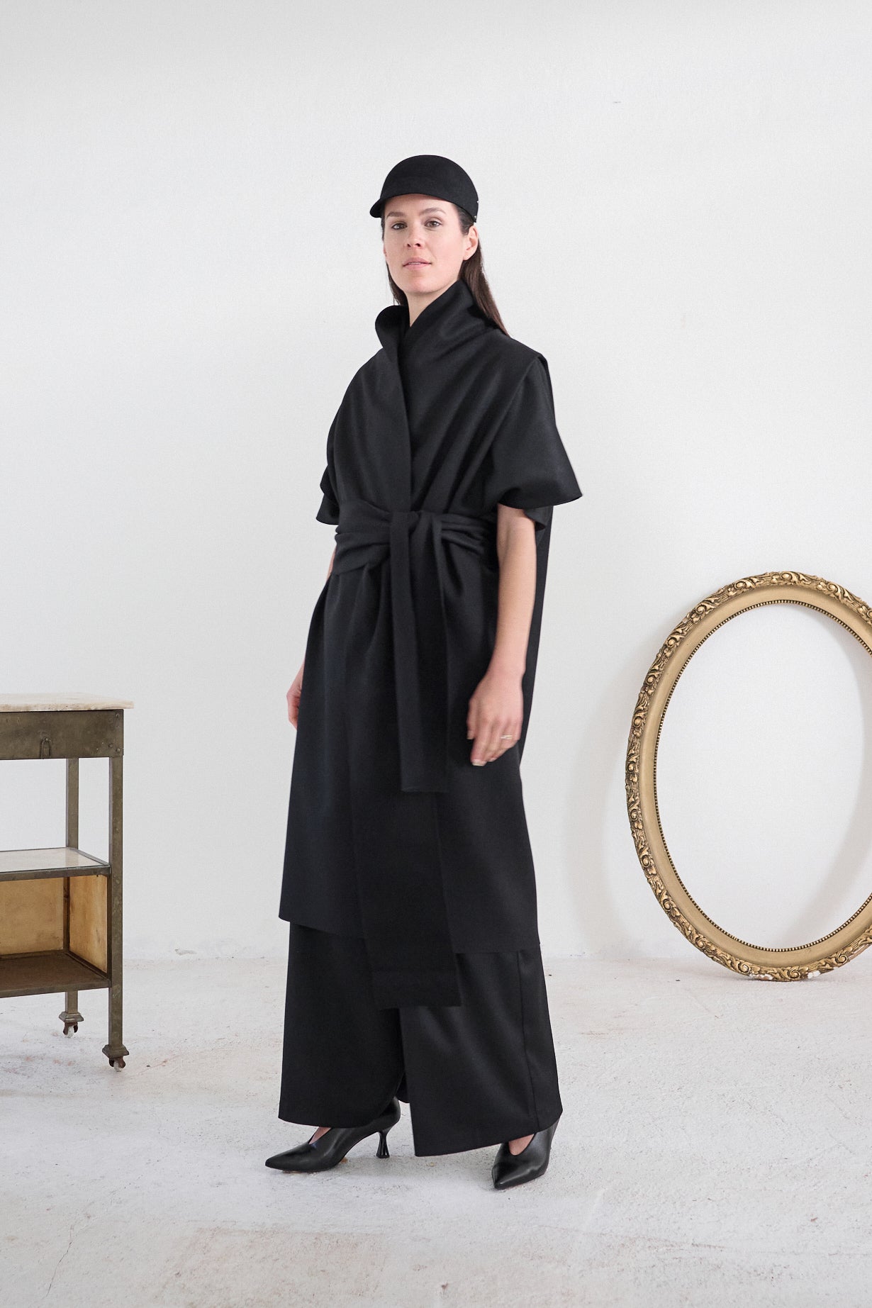Splývavý přehoz, vesta či teploučké šaty z jemné vlny v délce těsně pod kolena. Kompaktní, čistý, bez jediného švu. Vnese eleganci do každého outfitu a zároveň nechává volně dýchat vrstvy pod ním. Odvážně hluboký průramek poodhaluje tajemství, které nositel střeží pod svrchní vrstvou. Překlad v zádech přináší nesčetné množství stylingu. Přední klopy ahalují siluetu do šálového límce. Dominantní pásek spolu s hlubokými průramky dává možnost stylingu na mnoho způsobů. Příjemně zahřeje jako svrchní vrstva, ale i doteplení kabátu, anebo jako teplejší solitér do chladnějších vnitřních prostor. Důstojnost, která se nonšalantně vlní kolem postavy.